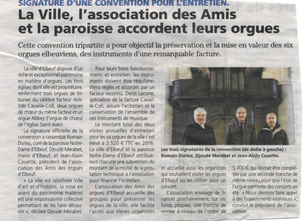 L’Association a signé une convention avec la Mairie et la Paroisse pour l’entretien des orgues d’Elbeuf. Quelques photos :
