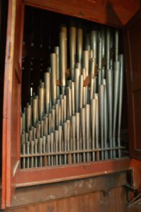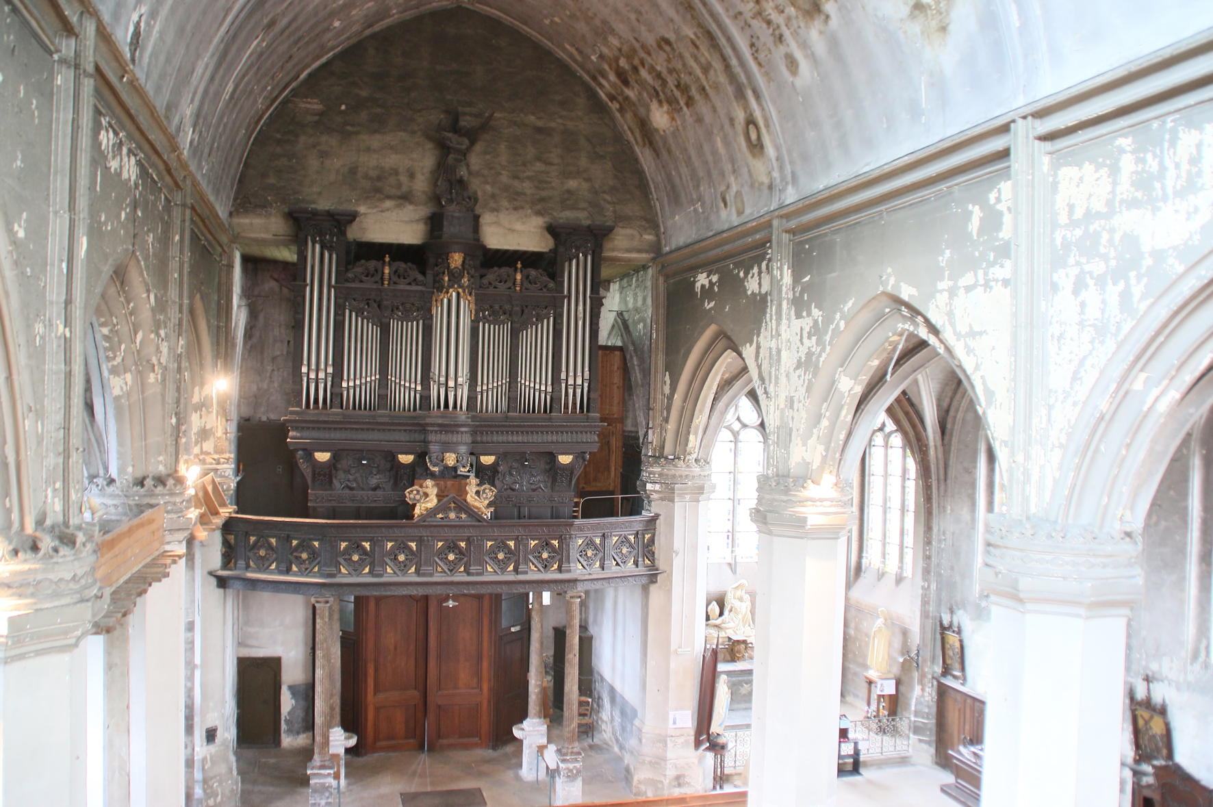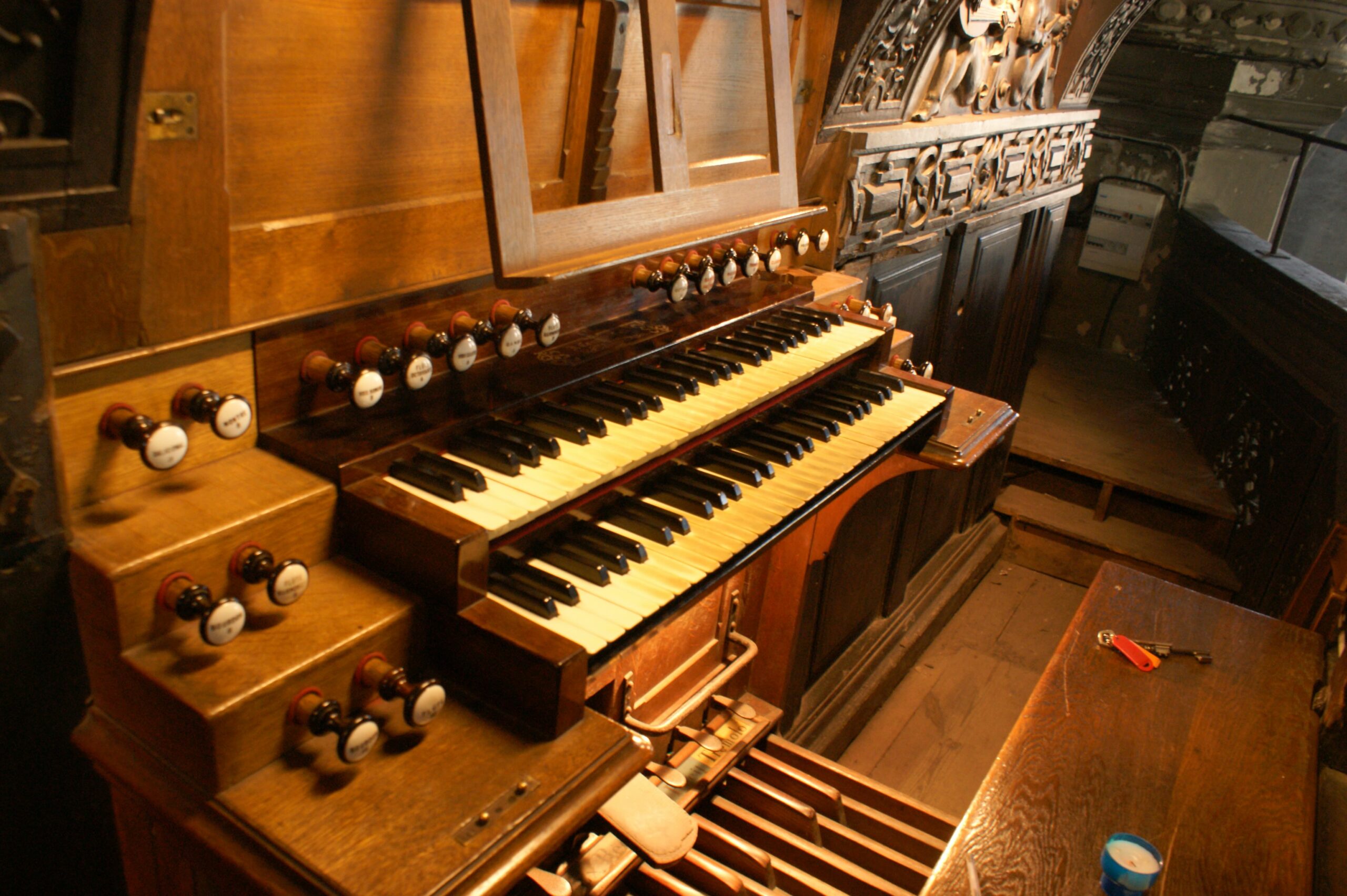 | Bourdon 16 Montre 8 Bourdon 8 Flûte Harmonique 8 Salicional 8 Prestant 4 Plein Jeu IV Trompette 8 Clairon 4 | Gambe 8 Voix Céleste 8 Flûte harmonique 8 Flûte octaviante 4 Octavin 2 Voix Humaine 8 Basson-Hautbois 8 Basson 16 Trompette 8 Clairon 4 | Flûte 16 Soubasse 16 Flûte 8 |